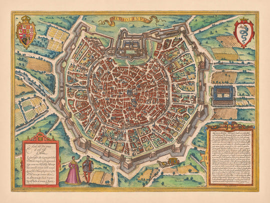 The map titled "Mediolanum," crafted by the renowned cartographers Georg Braun and Frans Hogenberg in 1572, offers a captivating bird's eye view of Milan. This exquisite piece is part of the influential "Civitates Orbis Terrarum," a collection that stands as a testament to the urban planning and architectural grandeur of the Renaissance. The map’s finely colored illustrations vividly capture the essence of Milan, showcasing its intricate layout and fortifications. As one of the earliest obtainable views of the city, it provides a unique glimpse into the historical landscape of this vibrant Italian metropolis.