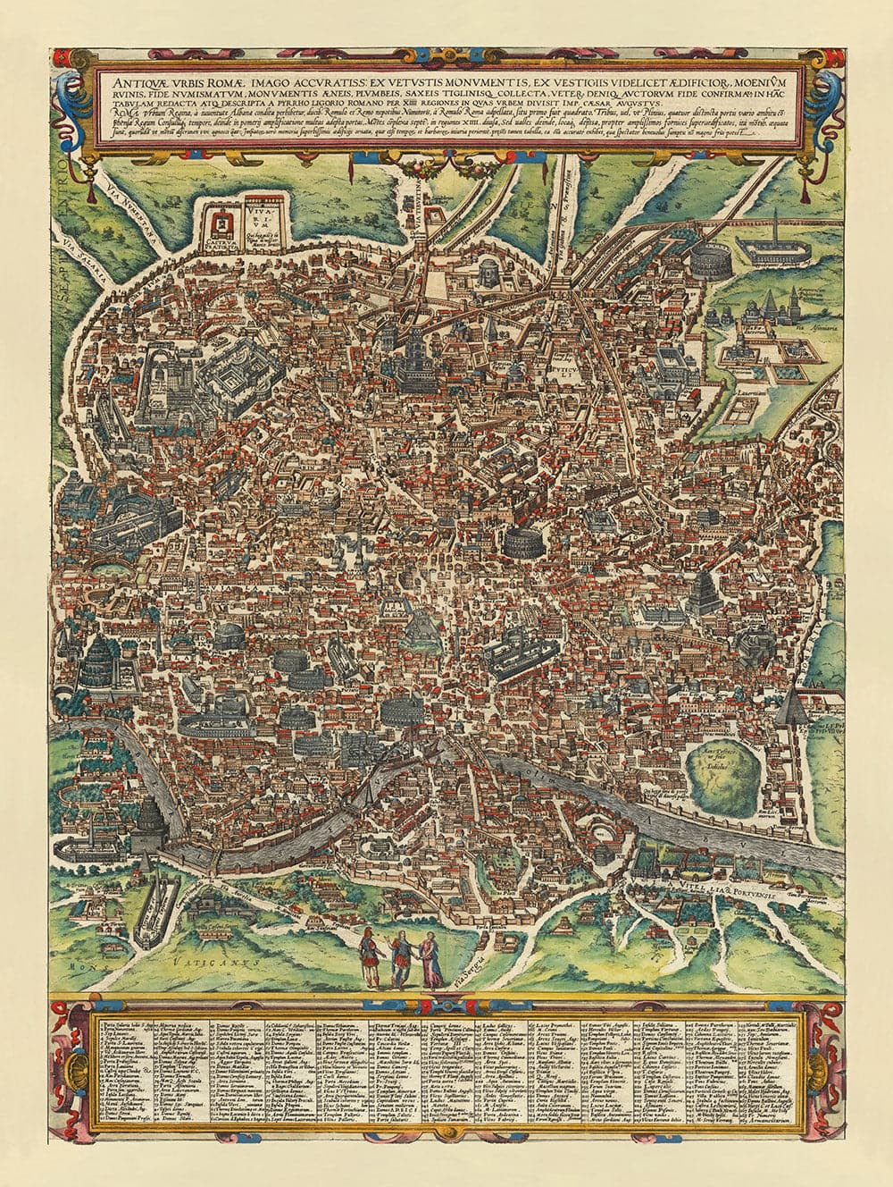 Old Map of Rome, 1588 by Georg Braun: Forum, Pantheon, Circus Maximus, Colosseum, Vatican