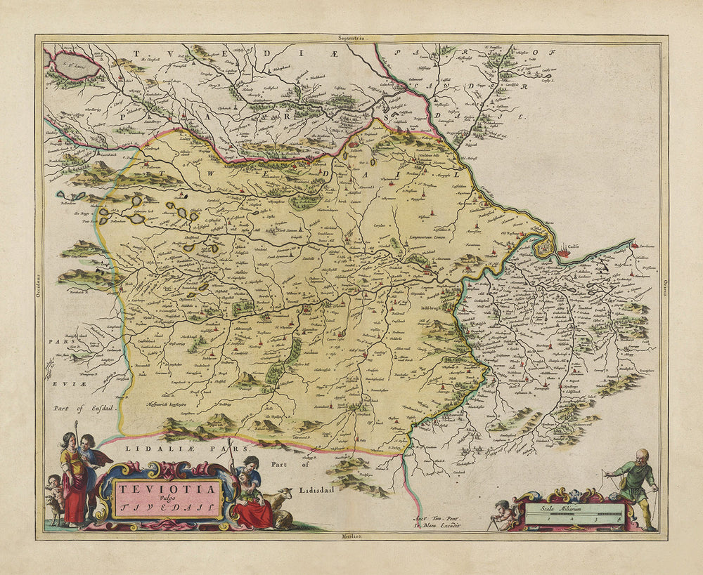 This exceedingly rare, old full colour map of the county of Roxburgh in Scotland was created by master mapmaker Joan Blaeu from his workshop in Amsterdam and originally published in 1665 as part of his Theatrum Orbis Terrarum Sive Atlas Novus.