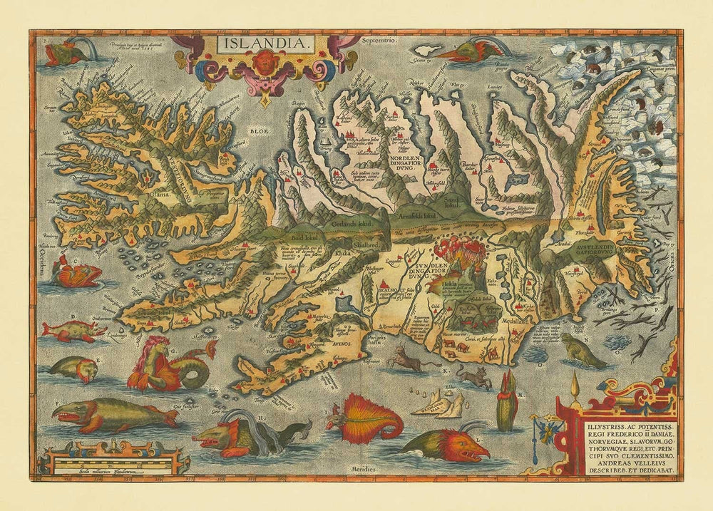 Rare Old Map of Iceland by Ortelius, 1603: Reykjavik, Keflavik, Volcanoes, Mountains, Fjords, Glaciers, Sea Monsters