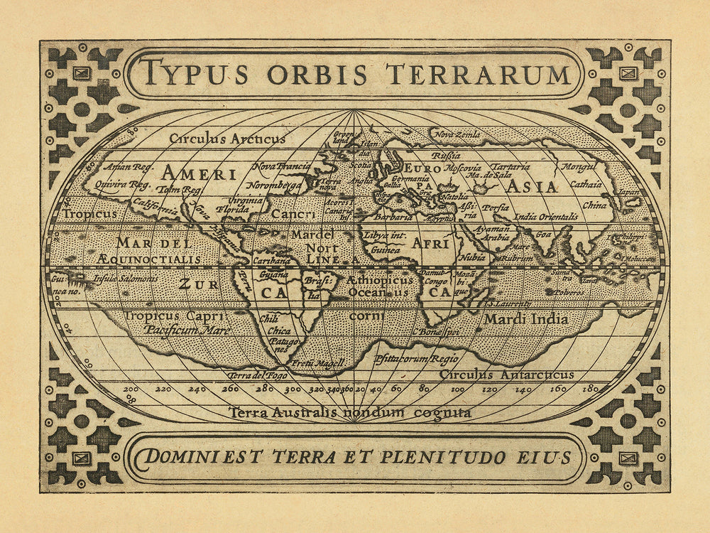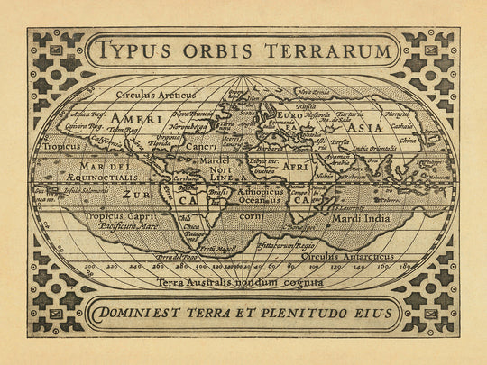 The "Typus Orbis Terrarum" also includes fascinating speculative regions, such as Terra Australis nondum cognita, or the "Southern land not yet discovered," which stretches across the entire southern side of the map. This area includes Tierra del Fuego and Psittacorum Regio, a region supposedly densely populated with parrots, reflecting the limits of contemporary knowledge and the imaginative nature of early cartography. The map also shows North America with familiar toponyms like California, Virginia, and Florida, as well as less familiar ones like Anian and Quivira, hinting at the elusive Northwest Passage.
