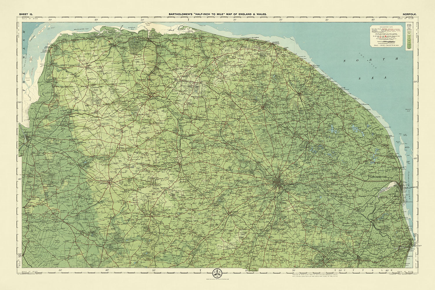 Bartholomew's "Sheet 15 - Norfolk" is more than just a map; it is a historical document that encapsulates the essence of Norfolk at a pivotal moment in its history. The map's clarity, accuracy, and aesthetic appeal make it a treasured piece for collectors and history enthusiasts alike. Whether you are drawn to its cartographic beauty, its historical significance, or its detailed portrayal of Norfolk's landscapes and landmarks, this map is a timeless testament to Bartholomew's enduring legacy in the world of cartography.