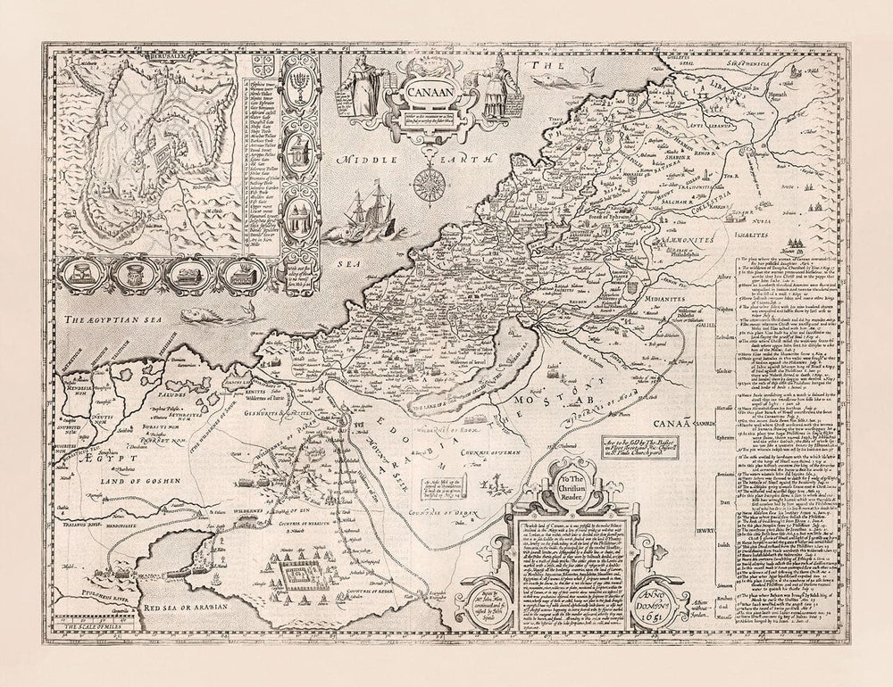 This map has many interesting features - but most notable is that it shows the journey of Moses and the Israelites as they are exiled from Egypt, wander around the Dead Sea, and eventually to the Plains of Moab. In the bottom left corner you can even see Moses parting the Red Sea!
