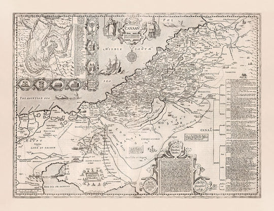 This old and exceedingly rare monochrome copperplate map shows the ancient middle eastern region of Canaan - modern day Israel, Palestine, Lebanon and parts of Jordan and Syria - in the early 1600s. Created by one of Britain's most famed mapmakers, John Speed, the map was originally published in the twin atlases "The Theatre of the Empire of Great Britaine" and "A Prospect of the Most Famous Parts of the World."