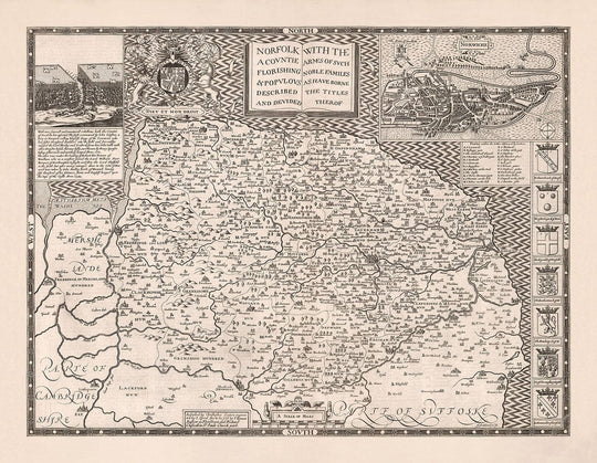 Old Map of Norfolk, 1611 by John Speed: Norwich, Great Yarmouth, King's Lynn, Thetford, Fakenham