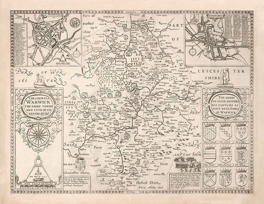 This old, monochrome and wonderful map shows the ancient county of Warwickshire as it was in 1611. It was created by John Speed and engraved by Jodocus Hondius, and originally published in Speed's "The Theatre of the Empire of Great Britaine".