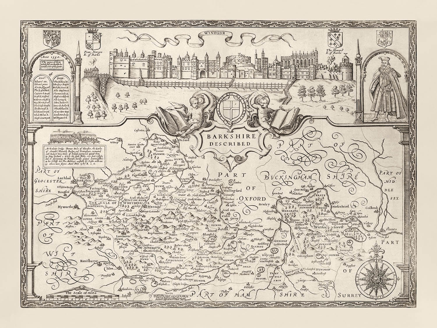 Many of the towns, villages and cities in Berkshire are already visible in this ancient map, such as Newbury and Reading. But centre stage goes to Windsor - and indeed, the entire top of the map is dominated by a lovely landscape of Windsor Castle.
