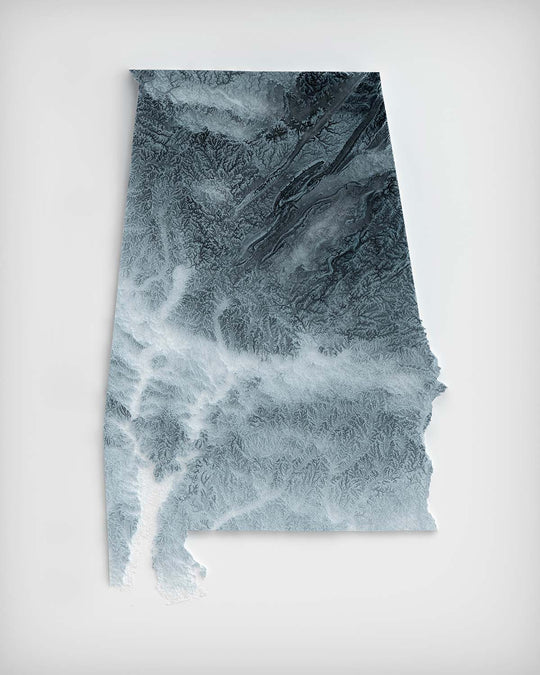 Immerse yourself in the richly sculpted landscape of Alabama, United States of America—a state where dramatic topography tells a story of ancient mountains, winding rivers, and gentle coastal plains. This map reveals Alabama’s geographic diversity in exquisite detail, with contours and elevations picked out through deft use of light and shadow. High ridges of the Appalachian foothills ripple across the north, each peak and undulation subtly highlighted, making the rugged terrain almost tactile. Here, valleys and deep hollows are gently shaded, creating a vivid sense of depth and drawing your eye to the rolling expanse of the Cumberland Plateau.