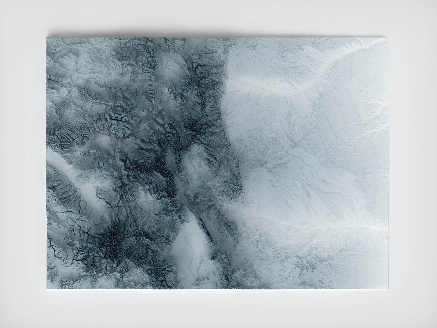 Our shaded relief prints use ultra high resolution topographic data and a secret 3D rendering process to create the illusion of raised terrain — like the mountains are about to lift right off the page. No labels, no borders, no distractions. Just the raw shape of the land, brought to life in a clean, modern style.