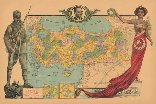 The map’s visual language is rich with symbolism. At its apex, Atatürk’s portrait is crowned with laurel leaves, a classical emblem of victory and honor, underscoring his pivotal role in shaping the republic. To the left, a Turkish infantryman in full regalia stands as a tribute to the sacrifices made during the War of Independence, while on the right, a woman draped in the Turkish flag personifies liberty and hope. This progressive iconography marks a deliberate departure from Ottoman visual traditions, embracing Western ideals and Atatürk’s secular vision for the country.