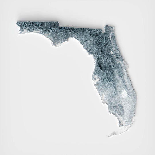 Trace the gentle curves of the coastline as it flows from the panhandle’s stretch down to the iconic tip of the Keys, capturing the undulating islands, offshore reefs, and barrier chains that define Florida’s aquatic boundaries. The Everglades are strikingly rendered as a broad, subtle expanse at the southern end, while the flat expanses of central and northern Florida rise almost imperceptibly in soft, gentle undulations—emphasized by the play of light and shadow, which delicately picks out the rolling Lake Wales Ridge and the ancient sandhills near Ocala.