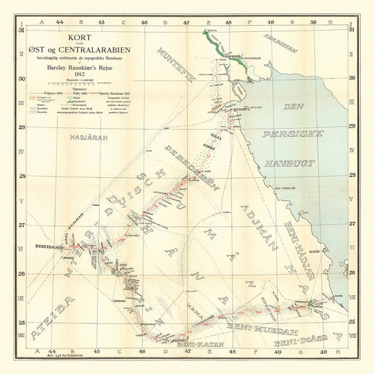 Kort over Øst og Centralarabien, created by the renowned Danish explorer Anders Christian Barclay Raunkiaer in 1912, is a captivating window into the early 20th-century exploration of the Arabian Peninsula. This map meticulously charts Raunkiaer's expedition through the largely uncharted deserts of eastern and central Arabia. It also traces the routes of fellow explorers William Gifford Palgrave and Sir Lewis Pelly, providing a comprehensive overview of the region's exploration history. Raunkiaer's journey, marked by resilience and discovery, offers a rare glimpse into the Arabian landscape before the transformative discovery of oil.