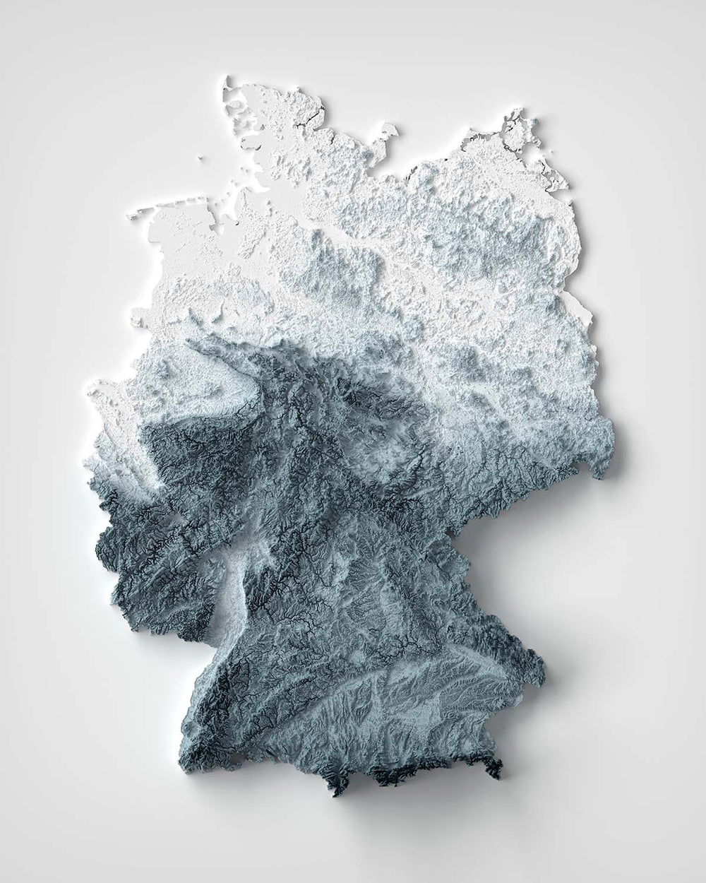 Germany's geography is a tapestry of contrasts: the south is defined by formidable Alpine summits and sparkling glacial valleys, their lofty highlands sharply modelled by crisp shading. Moving north, the land opens into expansive plateaus and fertile river valleys, including the winding Rhine, Danube, and Elbe, whose carved paths are elegantly traced on the map’s surface. The central high country, with its Thuringian Forest and the volcanic hills of the Eifel and Hunsrück, emerges with a tactile richness, emphasizing the subtle shifts that make these regions unique.