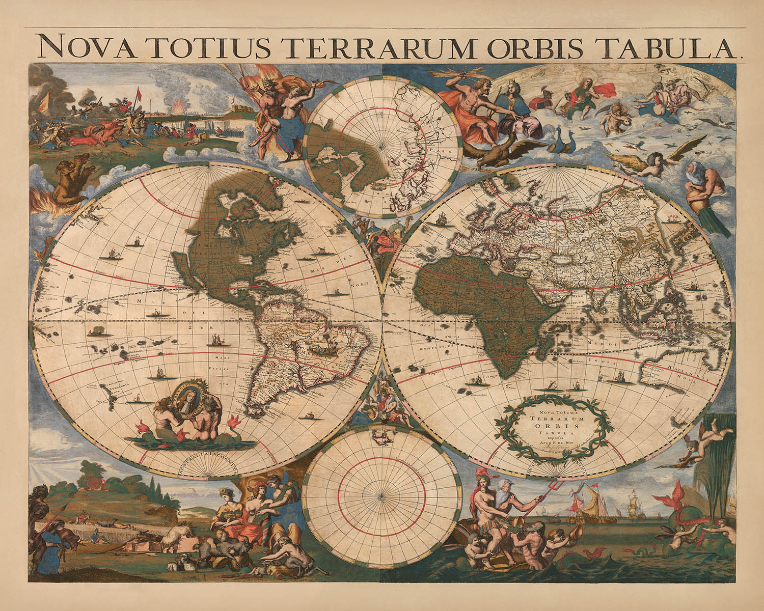 Large Masterpiece World Map by Danckerts, 1696: Mythical Lands, Decorative Border