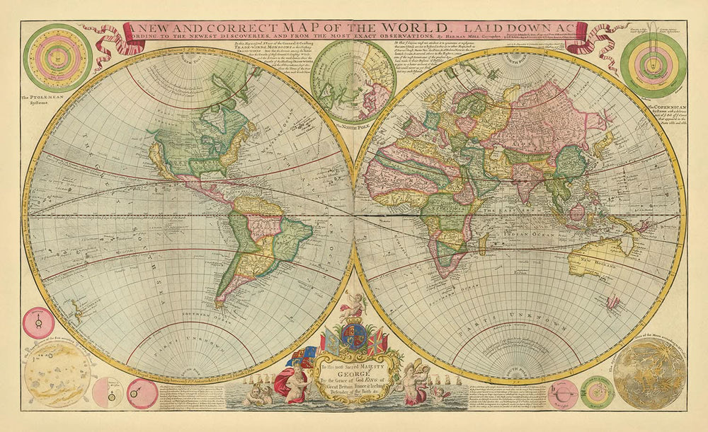 Herman Moll's "A New and Correct Map of the World Laid Down According to the Newest Discoveries, and from the Most Exact Observations" is a masterful representation of 18th-century cartography. Crafted in 1760, this map offers a glimpse into the era's geographical understanding and the spirit of exploration that defined it. Moll, a renowned British cartographer, was known for his detailed and decorative maps that captured the imagination of a public eager for knowledge about the world. His work often included critiques of his contemporaries, adding a layer of historical intrigue to his creations.