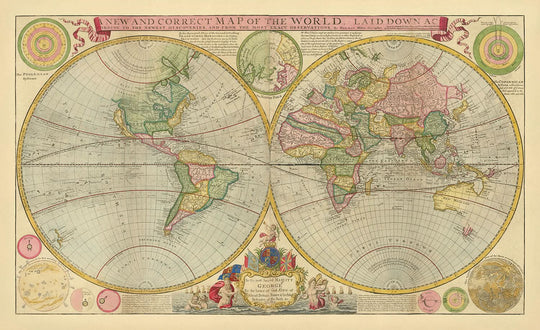 The map's style is both decorative and informative, featuring a double hemisphere design that elegantly frames the world's continents and oceans. Surrounding the hemispheres are a variety of astronomical diagrams, including representations of the planets and the solar systems according to Ptolemy and Copernicus. This blend of geography and astronomy underscores the Enlightenment's quest for knowledge and the interconnectedness of scientific disciplines during the period.
