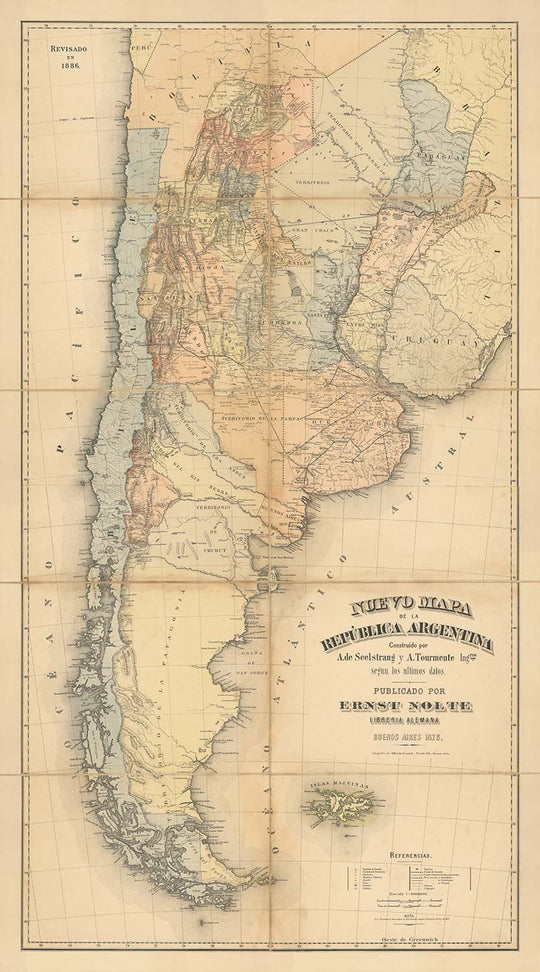 The "Nuevo Mapa de la República Argentina," crafted by the skilled hands of A. de Seelstrang and A. Tourmente and published by Ernst Nolte, is a remarkable cartographic achievement from 1886. This map captures a transformative period in Argentine history, when the nation was burgeoning with growth and European influence. It elegantly delineates the political and physical landscapes of Argentina and southern Chile, providing a window into a time when the country was expanding its territories and infrastructure. The map is a testament to Argentina's ambitions and its evolving identity as a nation of opportunity.