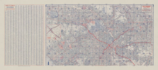 The map highlights significant neighborhoods that have shaped the cultural and social fabric of Los Angeles. From the vibrant heart of Downtown to the sprawling avenues of Hollywood, each area is meticulously charted, offering a glimpse into the diverse communities that have long called this city home. The inclusion of a detailed street index further enriches your journey, allowing you to trace the paths of history through these iconic districts.