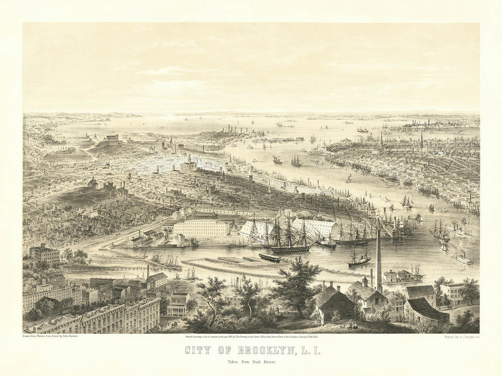 Step into the dynamic world of mid-19th century New York with “City of Brooklyn, L.I. Taken from Rush Street,” a rare and evocative bird’s-eye view crafted by the accomplished artist and lithographer John Bornet in 1855. This remarkable map captures Brooklyn at a transformative moment, poised between its pastoral roots and burgeoning industrial future. The vantage point from Williamsburg sweeps southeast across the Brooklyn Naval Yard, offering a panoramic tableau that encompasses not only the neighborhoods of Brooklyn Heights and DUMBO but also the iconic skyline of Lower Manhattan shimmering across the East River.