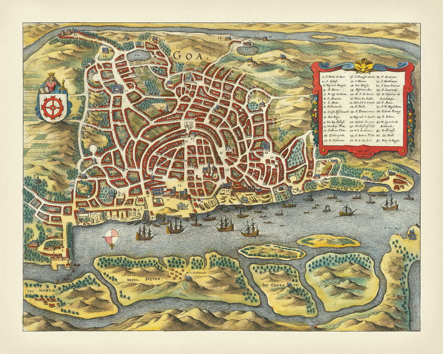 Goa, now a state in western coastal India, was once a central trading hub with a population of up to 200,000. This map captures the city’s vibrant life before it was abandoned in the 18th century due to a plague. Significant landmarks such as the Church of St. Francis near the water and the shrine on the hills to the east, then dedicated to St. Bras, are prominently featured. The map also highlights the palace of the Viceroy of Goa along the river, a testament to the city’s political importance during the Portuguese rule.