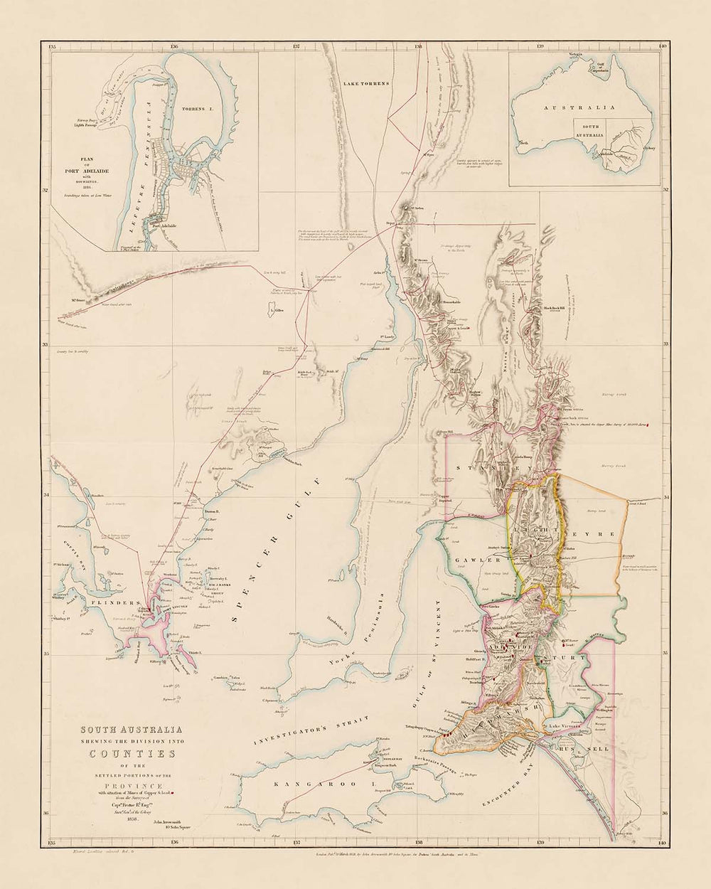 Old County Map of South Australia by Arrowsmith, 1858: Adelaide, Port Adelaide, Burra, Murray River, Copper Mines