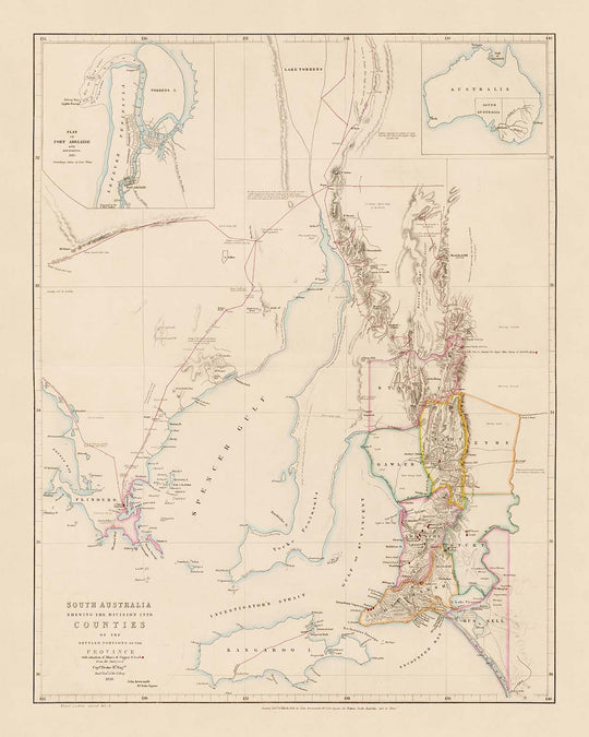 Beyond its economic and political dimensions, the map is also a celebration of place. It names and situates the settlements that would become today’s thriving communities—Adelaide, Port Adelaide, Gawler, and others—while capturing the sweep of natural features that have shaped South Australia’s history. The inclusion of an inset plan of Port Adelaide, complete with 1846 soundings, and an ancillary map of the Australian continent, situates the viewer within a broader narrative of discovery and connection. In every detail, this map invites us to trace the journey of a land and its people, rendered immortal by the steady hand of one of history’s greatest mapmakers.