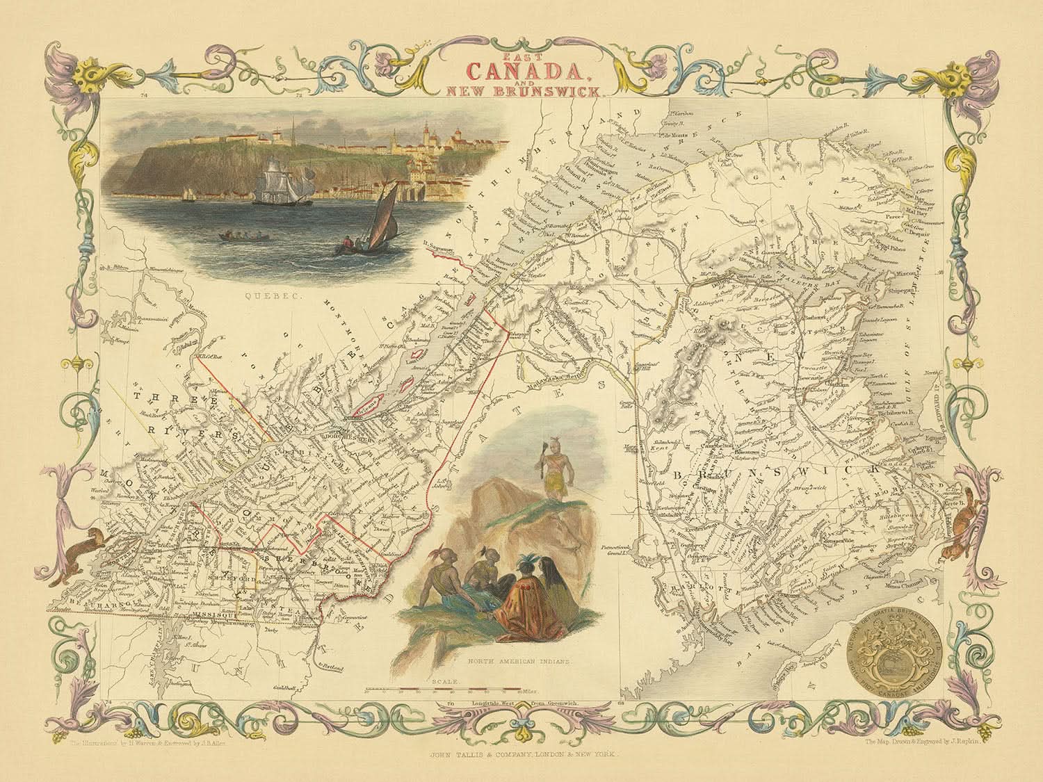 Old Map of East Canada and New Brunswick by Tallis, 1851: Montreal, Quebec City, St. Lawrence River