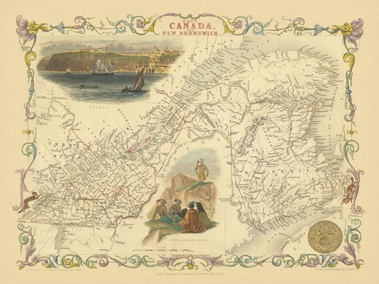 This map provides a detailed view of East Canada and New Brunswick, showcasing the political and physical landscapes of the mid-19th century. It intricately outlines counties and townships, with borders marked in vibrant red, offering a glimpse into the administrative divisions of the time. The map is adorned with decorative vignettes, including a captivating illustration of Quebec, which highlights the cultural and historical significance of this iconic city.