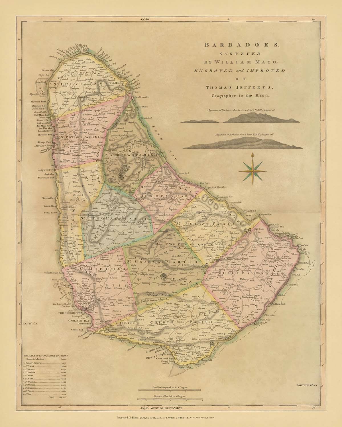 "Barbadoes, Surveyed by William Mayo, Engraved and Improved by Thomas Jefferys," is a captivating glimpse into the early 19th-century Caribbean. This exquisite map, published on March 12, 1810, by Laurie & Whittle, is a testament to the meticulous work of William Mayo, whose survey of Barbados set the standard for nearly a century. The map is a vibrant tapestry of the island's eleven parishes, each meticulously outlined and colored, offering a vivid representation of the political landscape of the time.