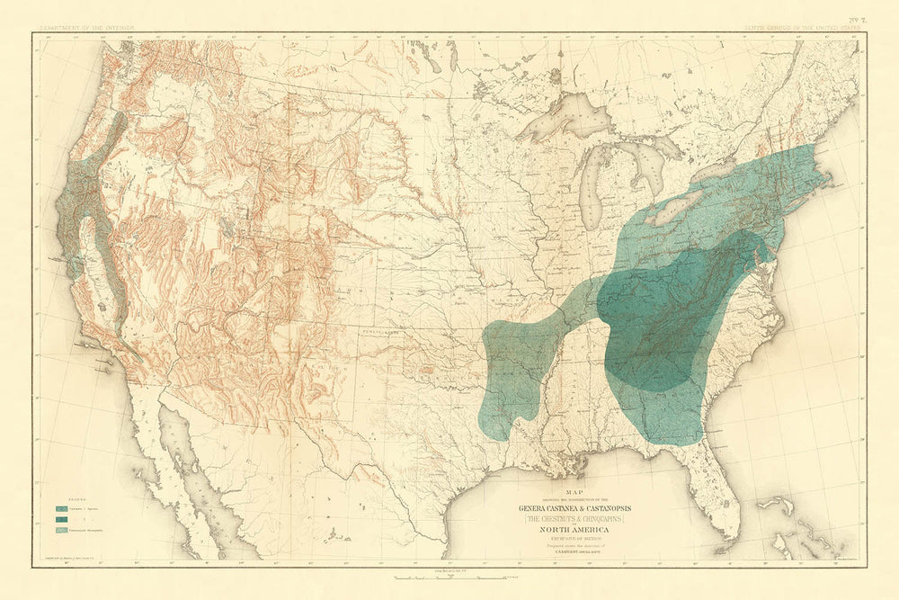 • Name of the map: Map Showing the Distribution of the Genera Castanea & Castanopsis (The Chestnuts & Chinquapins) in North America Exclusive of Mexico.