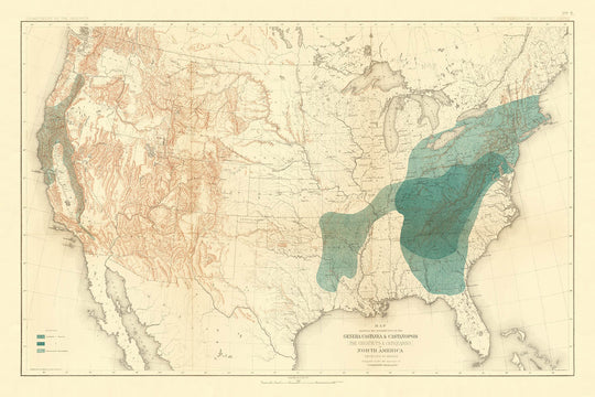 Step into the rich tapestry of North American botanical history with the "Map Showing the Distribution of the Genera Castanea & Castanopsis (The Chestnuts & Chinquapins) in North America Exclusive of Mexico," a masterwork prepared under the direction of C.S. Sargent for the Tenth Census of the United States in 1884. This remarkable thematic map is more than a scientific document—it is a vivid snapshot of a landscape before the devastation of the American chestnut, capturing the native range of chestnuts and chinquapins at a pivotal moment in ecological history. The map’s careful delineation of these genera’s habitats reveals the profound relationship between geography and the continent’s once-abundant hardwood forests.