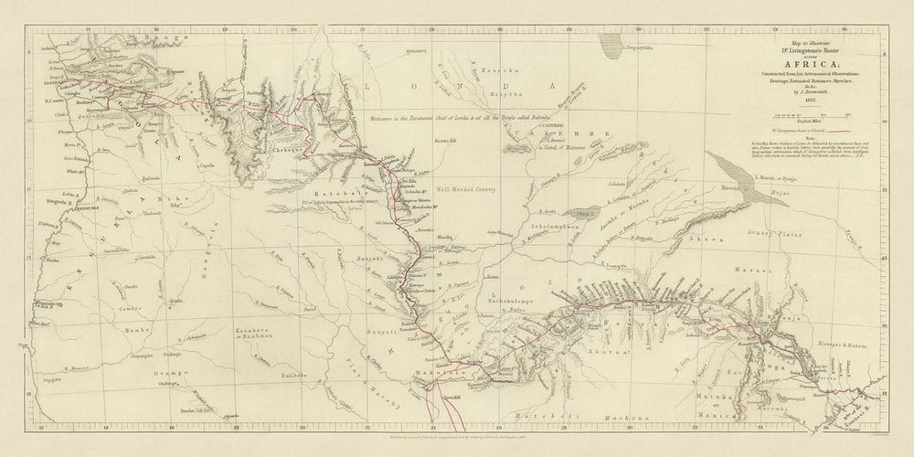 Embark on a journey through history with this exquisite map illustrating Dr. David Livingstone's legendary route across Africa, crafted by the esteemed cartographer John Arrowsmith in 1857. This map is not merely a depiction of geographical features; it is a testament to the spirit of exploration and discovery during the 19th century. Highlighted in red, Livingstone's path vividly captures his monumental trek from Linyanti to Quelimane, a journey that expanded European understanding of the African continent. This map stands as a remarkable fusion of science and adventure, constructed from meticulous astronomical observations and enriched by the explorer's interactions with local communities.