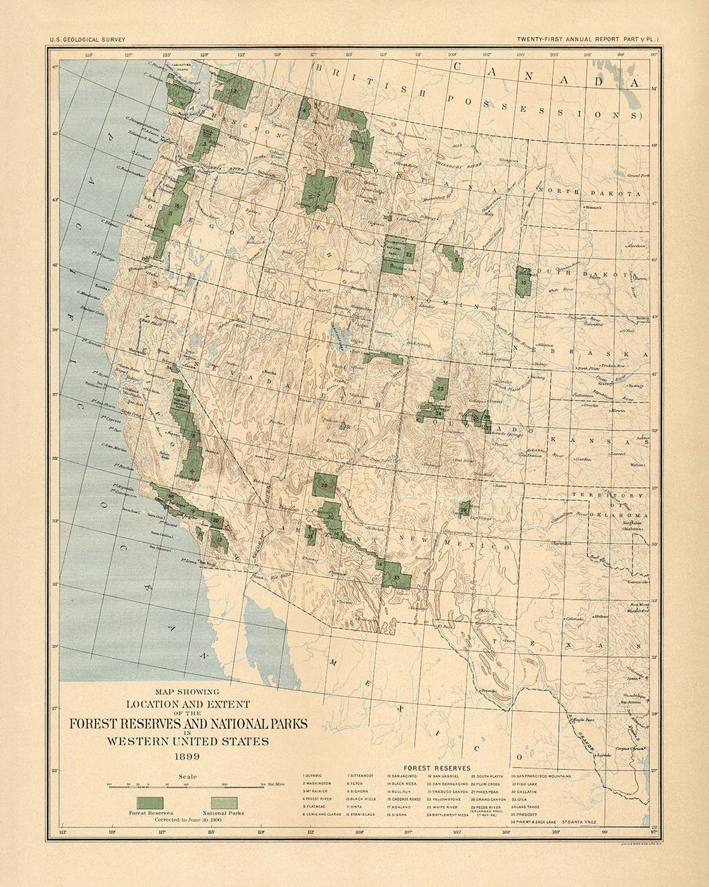 - Name of the map: Plate I. The Forest Reserves and National Parks in Western United States, 1899.