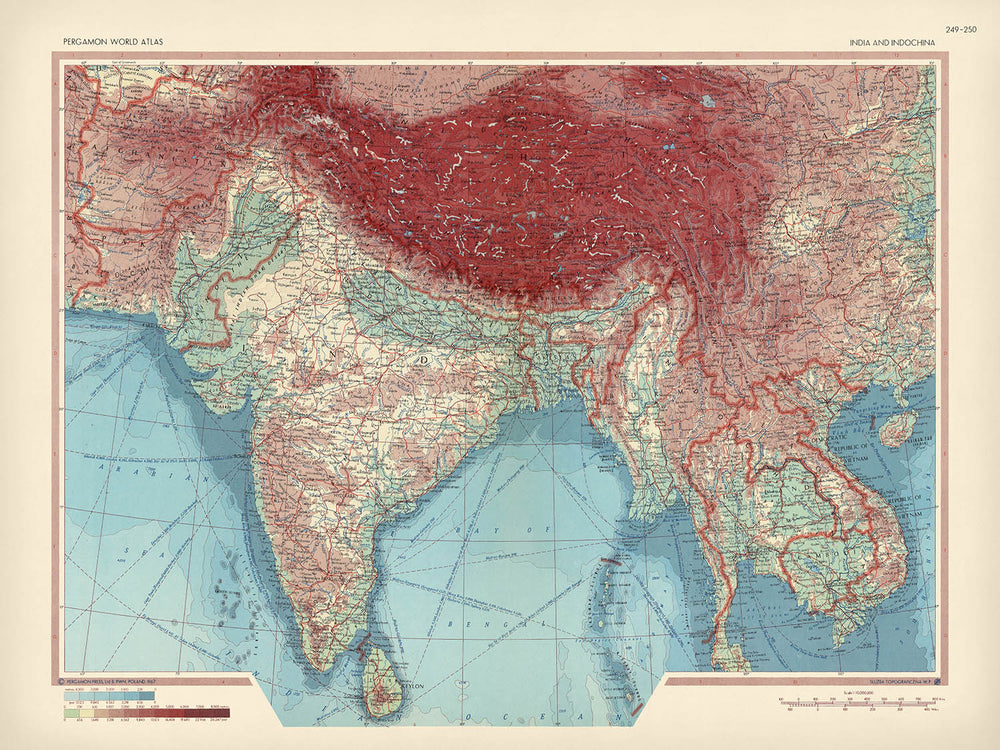 Step into the world of mid-20th-century cartography with the evocative “India and Indochina,” originally crafted in 1967 by the esteemed Polish Army Topography Service. This map, drawn from the English edition of the renowned Polish Atlas Swiata and published by Pergamon Press, offers a rare window into the political and physical landscapes of South and Southeast Asia during a period of profound historical transformation. The title itself—“India and Indochina”—hints at the sweeping geographical scope, spanning from the Himalayan peaks to the tropical coastlines of the Andaman Sea, and capturing the intricate tapestry of nations, borders, and natural wonders that define this region.