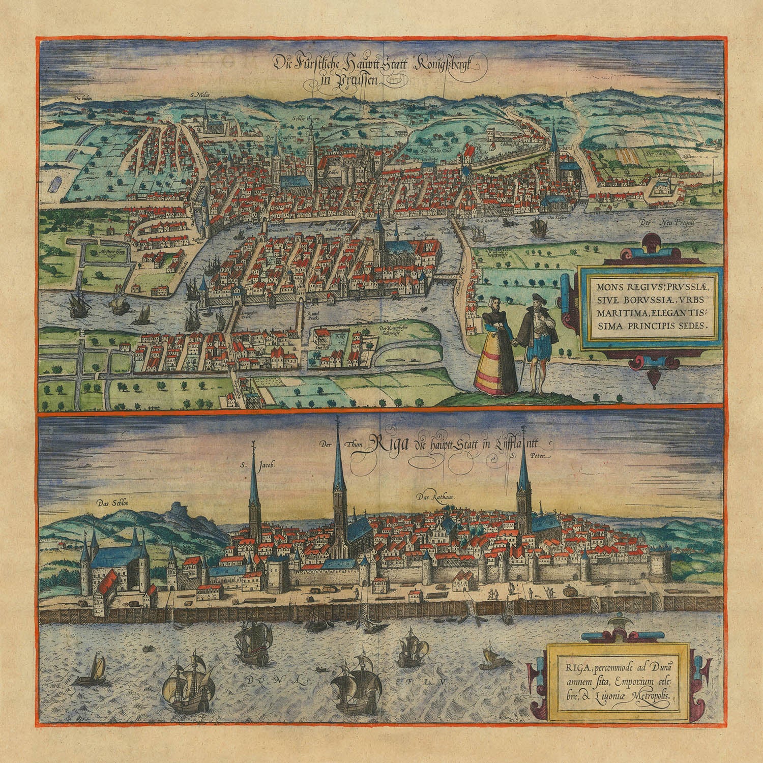 Old Map of Kaliningrad and Riga by Braun & Hogenberg, 1599: Churches, Towers, Ships, Ports, Attire