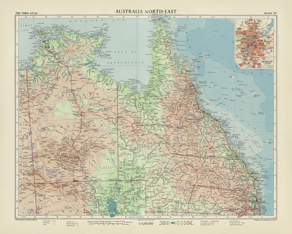 Step into the rich tapestry of history with the "Australia North-East" map, a captivating creation by the renowned cartographer John Bartholomew. This exquisite map, crafted in 1958, is part of "The Times Atlas of the World, Mid-Century Edition," a series celebrated for its meticulous detail and vibrant color. Bartholomew's work is a testament to the cartographic artistry of the mid-20th century, showcasing both political and physical landscapes with remarkable precision. The map's intricate design, featuring gradient tints and spot heights, invites you to explore the diverse terrains of Queensland and the Northern Territory.