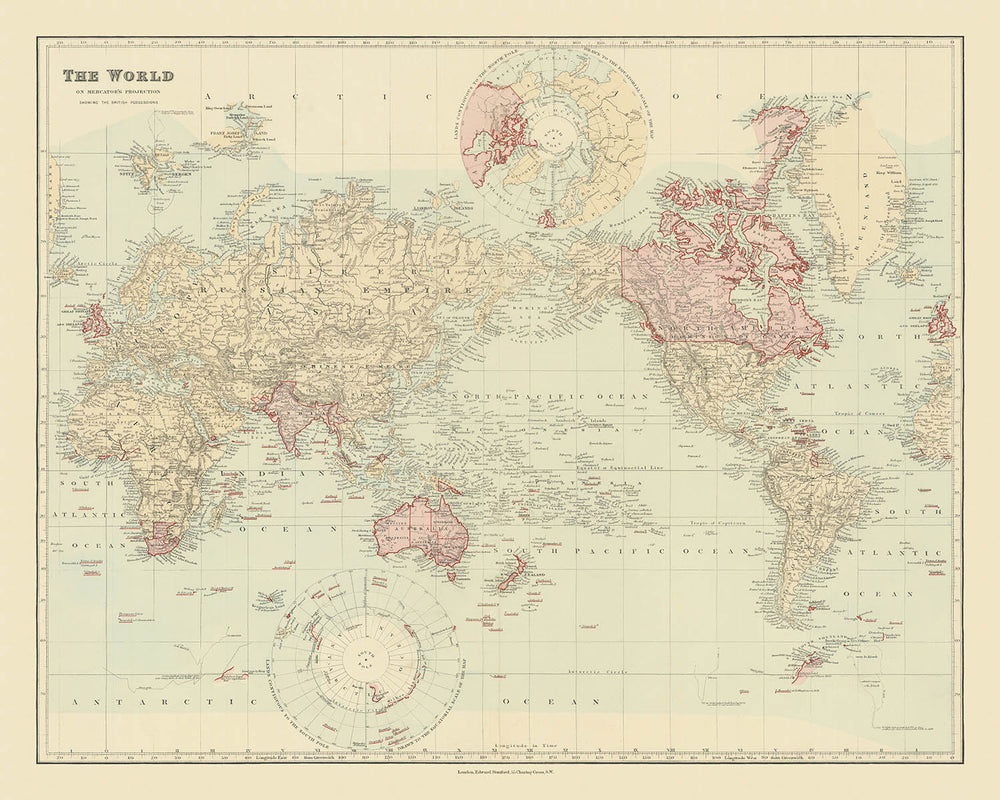 Old Mercator World Map of the British Empire by Stanford, 1894: Centred on the Pacific