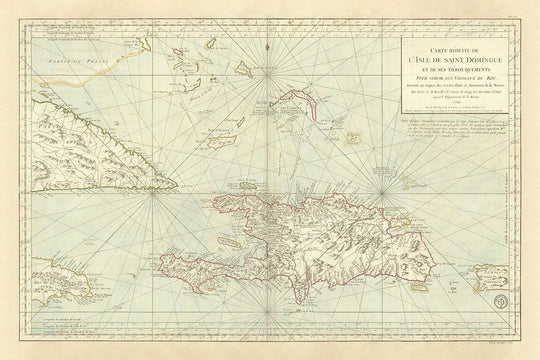 The "Carte Réduite De L'Isle De Saint Domingue et de ses Débouquements" is a captivating historical artifact, crafted in 1750 by the esteemed Depot de la Marine. This map offers a detailed glimpse into the Caribbean's colonial past, showcasing the intricate political and physical landscapes of the time. The map encompasses the vibrant islands of Hispaniola, Cuba, Jamaica, and Puerto Rico, along with the Turks & Caicos Islands and the Lower Bahamas. It serves as a testament to the era's navigational prowess, with its precise depiction of reefs, harbors, and nautical routes.