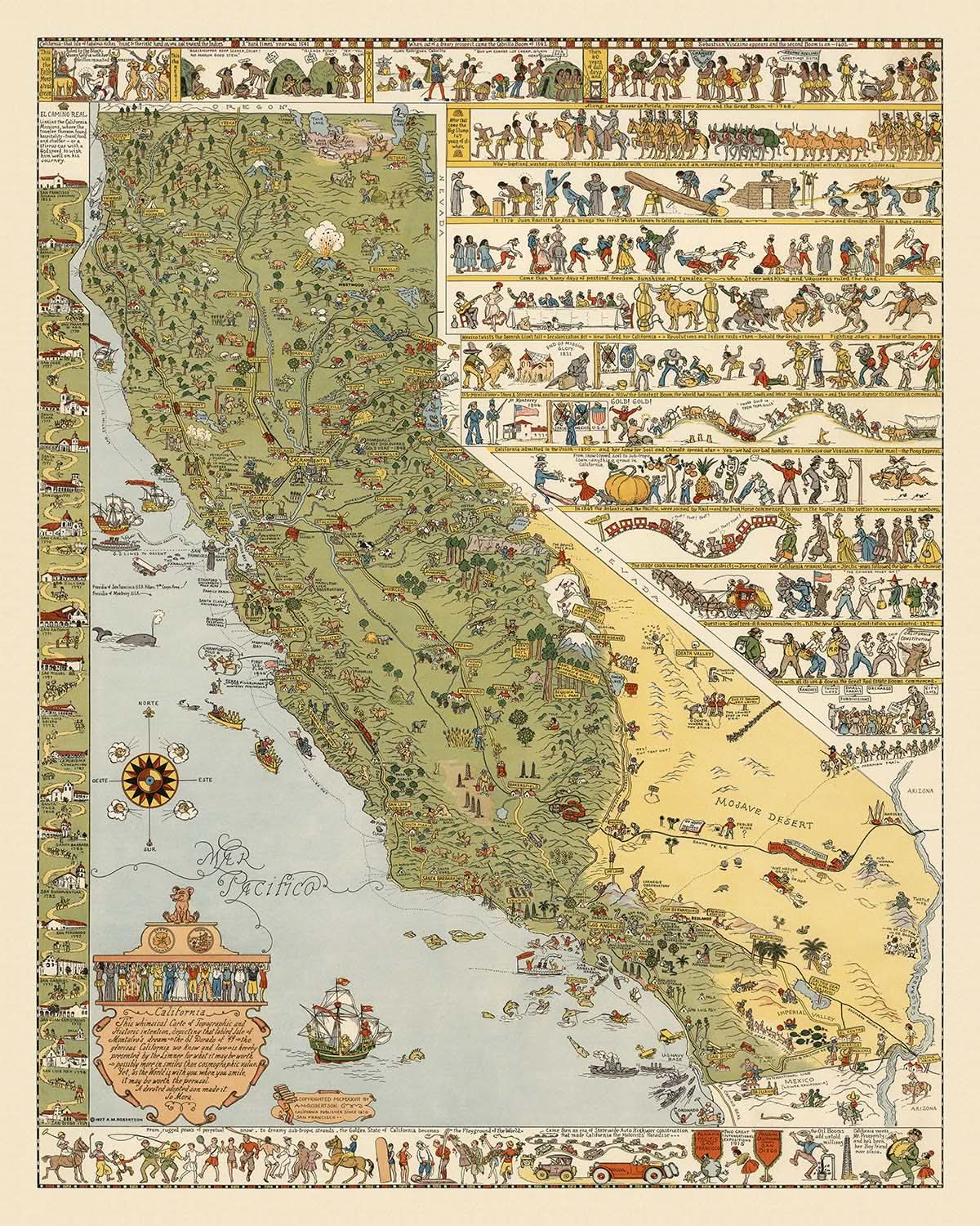 Old Pictorial Map of California by Mora, 1927: LA, SF, Yosemite, Sierra Nevada, Gold Rush