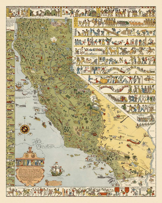 Step into the captivating world of early 20th-century California with Jo Mora's illustrious 1927 creation, "California." This pictographic masterpiece, Mora's first map of the Golden State, is a vibrant tapestry of history and culture, intricately woven with the artist's signature whimsy and detail. The map's decorative border frames a colorful depiction of California's diverse landscape, offering a visual journey through its storied past. Mora's artistic genius brings to life the state's rich heritage, from the Spanish missions dotting the coast to the bustling scenes of the Gold Rush era.