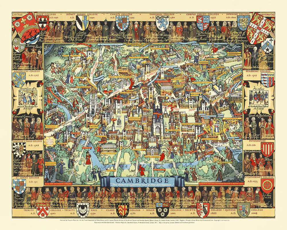 Kerry Lee, the celebrated British artist behind this work, was known for his intricate and decorative cartographic style. His maps are not just guides but artistic tributes, blending historical reverence with visual storytelling. In this map, Lee masterfully integrates heraldic shields, decorative borders, and depictions of historical figures, creating a piece that is as much about the spirit of Cambridge as it is about its geography. His work for the Travel Association of Great Britain and Northern Ireland reflects a post-war era's pride in national heritage and its invitation to explore the cultural treasures of England.