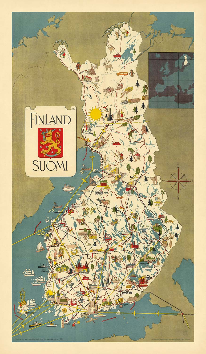 - Design and style: Color pictorial map using lithography by the Finnish Literature Society.