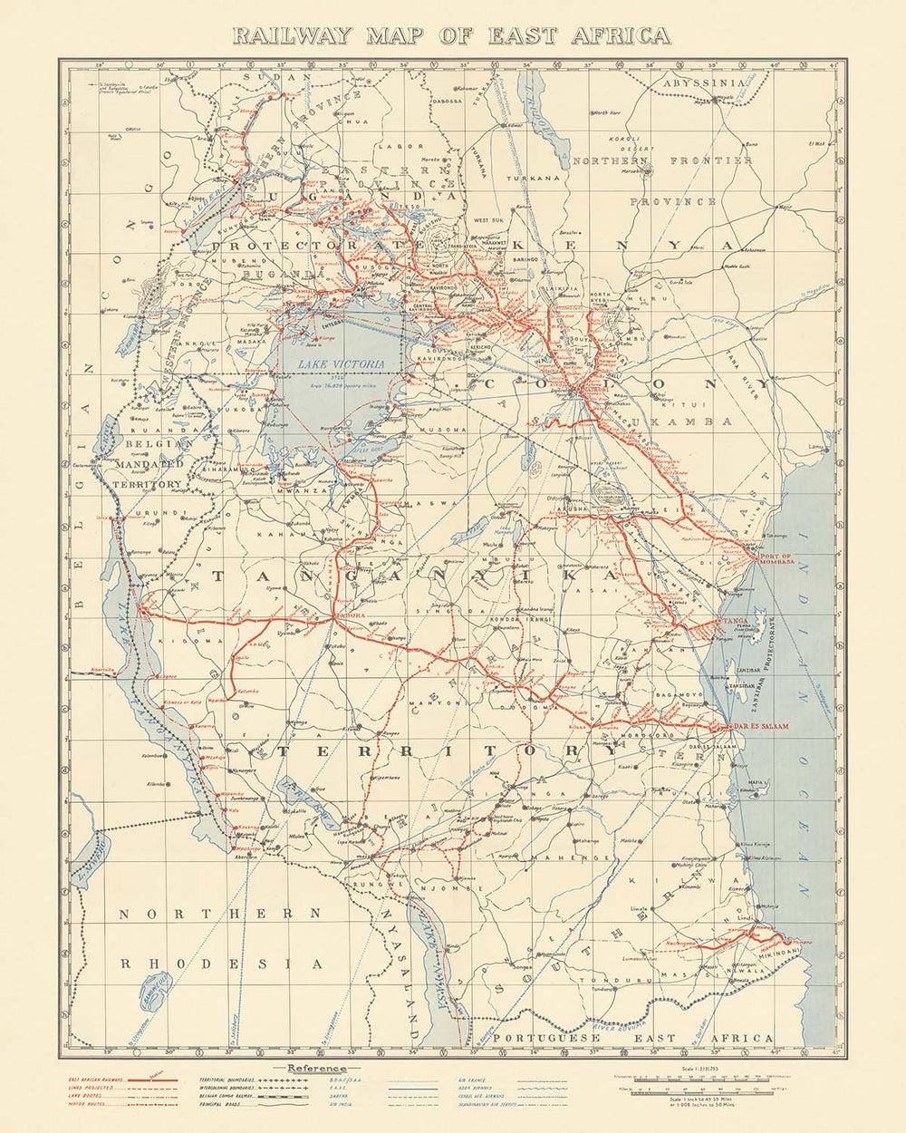 Cities and towns such as Nairobi, Dar es Salaam, and Kampala are prominently marked, each a hub of activity and growth during this era. The inclusion of smaller towns like Nakuru and Arusha further enriches the map, providing a comprehensive view of the settlements that dotted the landscape. These urban centers were vital nodes in the transportation network, facilitating the movement of goods and people across the region.