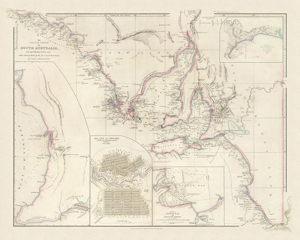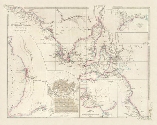 John Arrowsmith's map is celebrated for its understated elegance and clarity, characteristics that define his contribution to modern cartography. His work is recognized as one of the first truly "modern" atlases of the era, blending aesthetic appeal with functional design. The map's detailed insets, such as the Gulf of St. Vincent and the City of Adelaide, highlight the precision and depth of Arrowsmith's surveys, offering a rich tapestry of the region's maritime landscape.