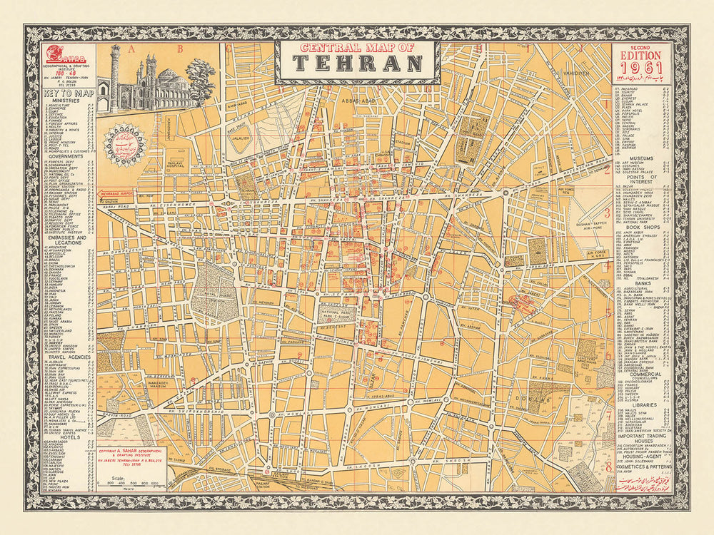 Abbas Sahab, often hailed as the “father of Iranian cartography,” infused this map with both technical precision and artistic flair. His Sahab Geographic Drafting Institute, founded in 1935, was at the forefront of Iran’s cartographic evolution, and this map is a testament to his deep knowledge of Tehran’s streets and spirit. The elegant vine motifs that border the map nod to traditional Persian aesthetics, while the modern, streamlined design signals a new era for both the city and the nation.