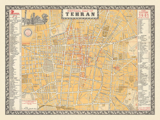 The map’s artistry is further elevated by its inclusion of 218 significant locations, each meticulously numbered and referenced. Landmarks such as Tehran University, the city’s renowned embassies, and its cultural institutions are clearly marked, offering insight into the social and political life of the era. The presence of Park-e-Shahr (City Park) and other green spaces highlights the city’s dedication to public life and leisure, while the artistic vignette of the Sepahsalar Mosque pays homage to Tehran’s architectural legacy and its role as a bridge between Iran’s Qajar and Pahlavi dynasties.