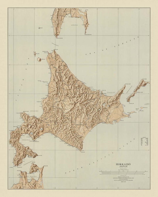 The map titled "Hokkaido, Japan," crafted in 1944 by the United States Department of the Interior, Geological Survey, for the US Air Force, is a remarkable testament to the cartographic excellence of its time. This map is not just a geographical representation; it is a historical artifact that captures the strategic military interests of World War II. With its detailed topographic features and 3D relief effects, it offers a vivid portrayal of Hokkaido's diverse landscape, making it a fascinating piece for collectors and history enthusiasts alike.