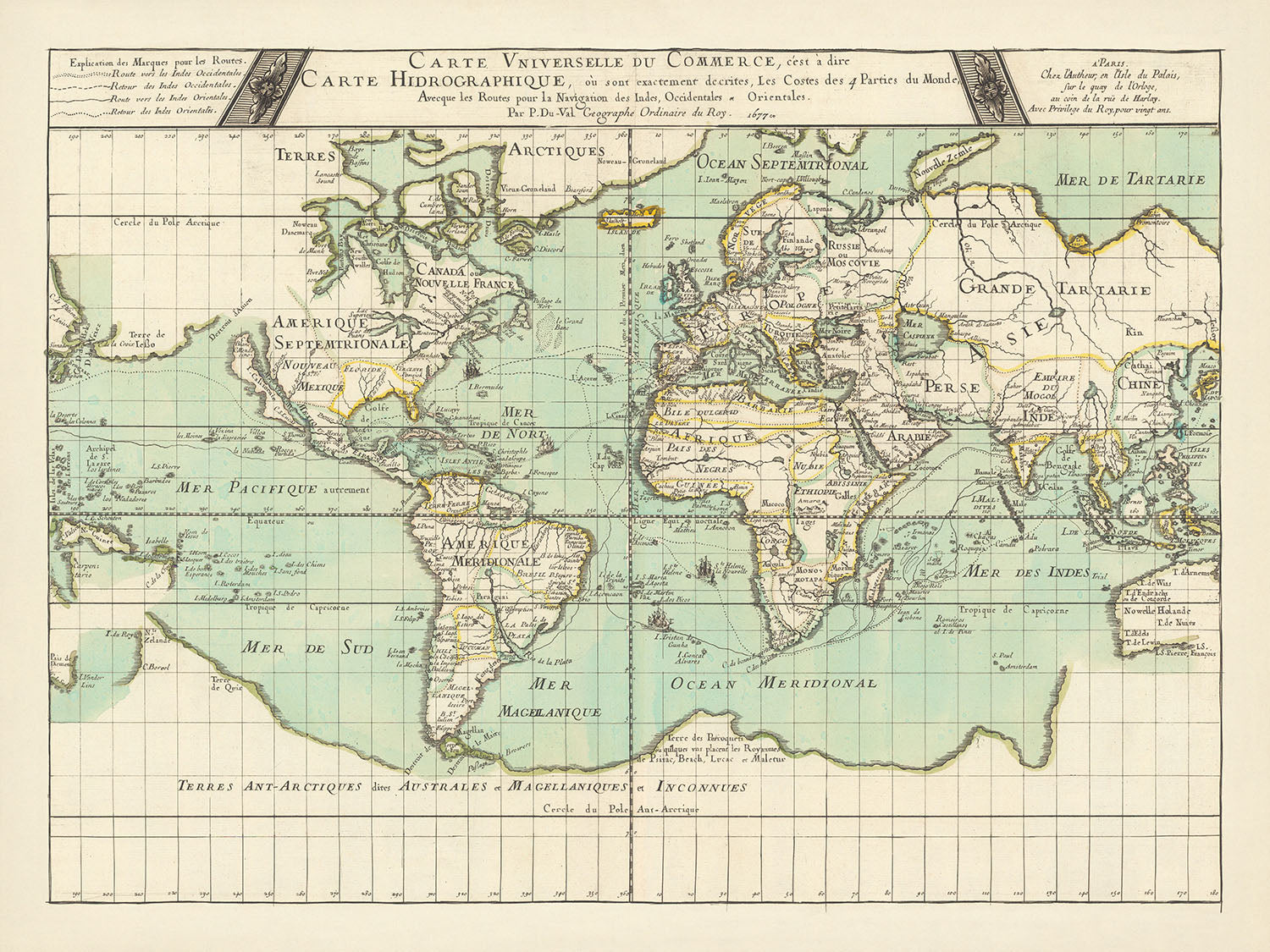 Introducing the "Carte universelle du commerce," a masterful creation by the esteemed French geographer Pierre Du Val in 1677. This map, a second edition following its initial release in 1674, is a testament to the rich cartographic tradition of the 17th century. Du Val, a prolific author and the nephew of the renowned Nicolas Sanson, crafted this map with the specific intent to aid traders and navigators. It meticulously charts the trade routes to and from the East Indies and the West Indies, offering a fascinating glimpse into the commercial lifelines of the era.