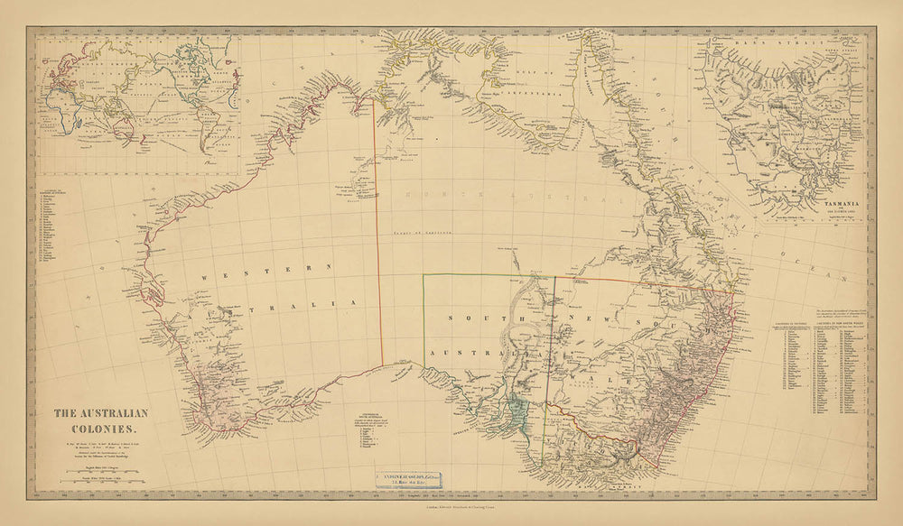 Edward Stanford, whose name would soon become synonymous with the finest maps of the British Empire, was uniquely positioned to create such a work. His privileged access to the Colonial Office and the Royal Geographic Society allowed him to incorporate the latest intelligence from the frontiers of exploration and governance. This map stands as Stanford’s inaugural depiction of Australia, reflecting both his technical mastery and his ability to capture the geopolitical pulse of the era.