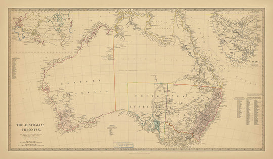 Beyond its political intrigue, the map is a celebration of Australia’s dramatic geography. It meticulously charts the sweep of the Great Australian Bight, the intricate waterways of the Murray and Darling Rivers, and the rugged contours of the Blue Mountains and Australian Alps. The insets and main map alike highlight Tasmania—recently renamed from Van Diemen’s Land—alongside the prominent islands of Kangaroo, King, and Flinders, and the distant promontories of Cape York and Arnhem Land. These natural features, paired with the careful delineation of peninsulas, gulfs, and straits, evoke both the challenges and the allure of the Australian continent.